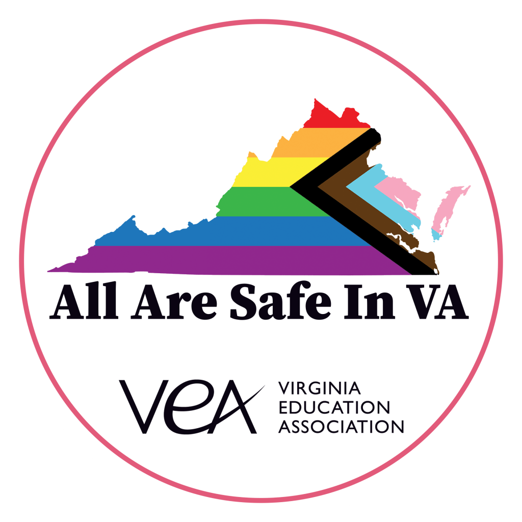At VEA, we recognize that LGBTQ+ students and staff often face unique challenges in our schools. They’re frequently targeted for bullying, harassment, and discrimination, and students have higher suicide rates than their peers. They need and deserve safe and affirming public schools. This is why VEA’s LGBTQIA+ Standing Committee has designed and created inclusive buttons and stickers. These were designed with Virginia’s students and staff in mind, and when worn, students can identify safe and supportive staff members.